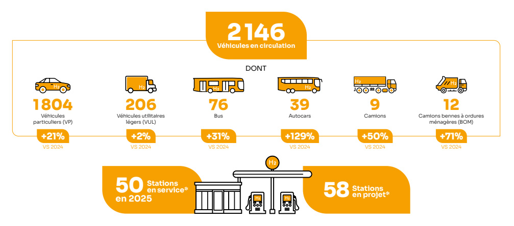 Selon France Hydrogène, 2 146 véhicules hydrogène circulaient dans l’Hexagone à fin 2025, soit une hausse de 20 % par rapport à l’année précédente. Ce chiffre masque cependant une réalité contrastée.