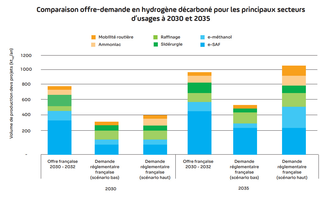 La France recense aujourd’hui 91 projets de production d’hydrogène décarboné, représentant un potentiel de 1,1 MtH?/an à horizon 2035. L’électrolyse est la technologie dominante, mais les investissements peinent à se concrétiser : sur les 6,7 GW de capacités d’électrolyse en projet, seulement 4 % des capacités projetées ont franchi le cap de la décision finale d’investissement (FID) en 2025.« En 2025, 50 MW de capacité d’électrolyse sont installés en France, tandis que 252 MW ont fait l’objet d’une décision finale d’investissement (FID) » chiffre l'association, qui estime que la capacité installée atteindrait 300 MW à fin 2026.