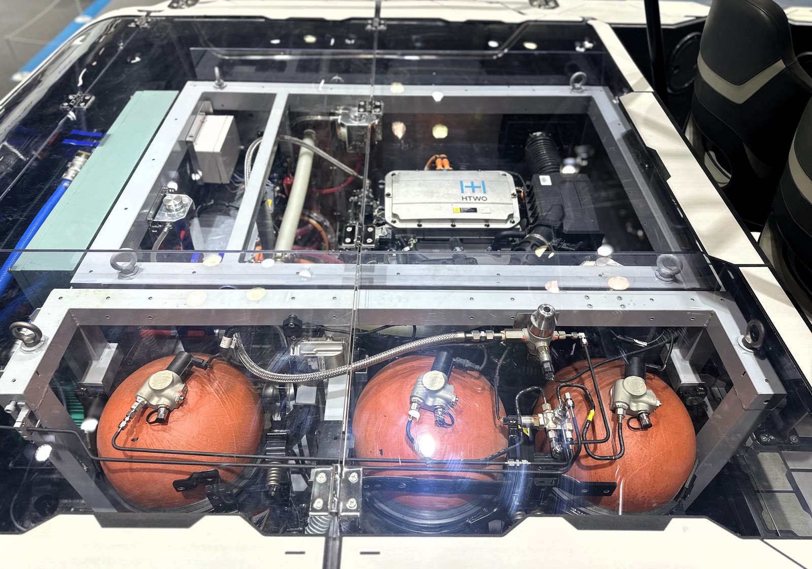 Hyundai n'est pas venu les mains vides à la World Hydrogen Expo, organisée à Séoul. Sur un vaste stand consacré à l’ensemble de ses activités hydrogène, le constructeur présentait un bateau à hydrogène équipé de la technologie à pile à combustible de sa filiale HTWO.