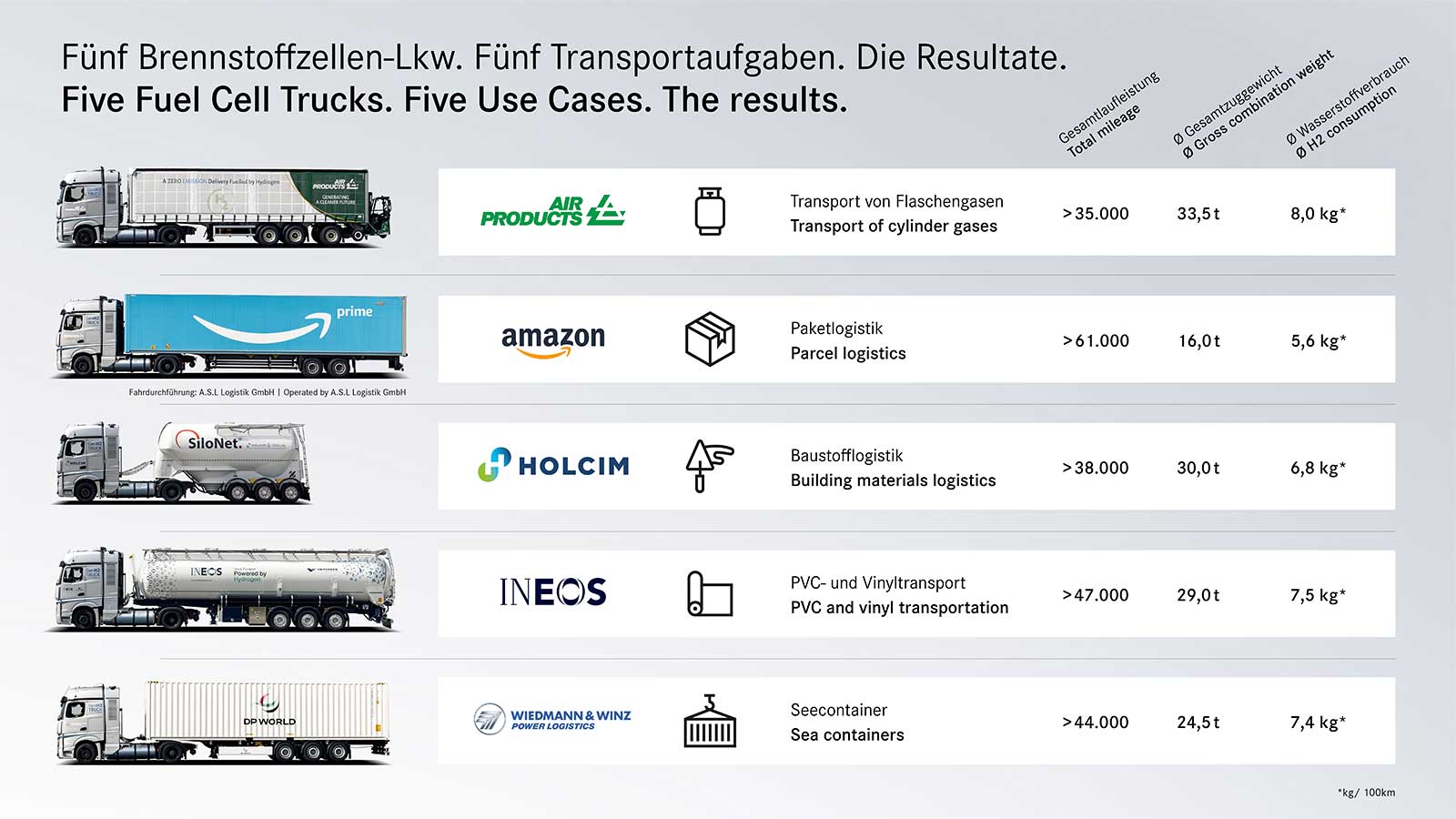 - Cinq camions hydrogène Mercedes GenH2 ont parcouru plus de 225 000 km en un an avec cinq grands clients européens