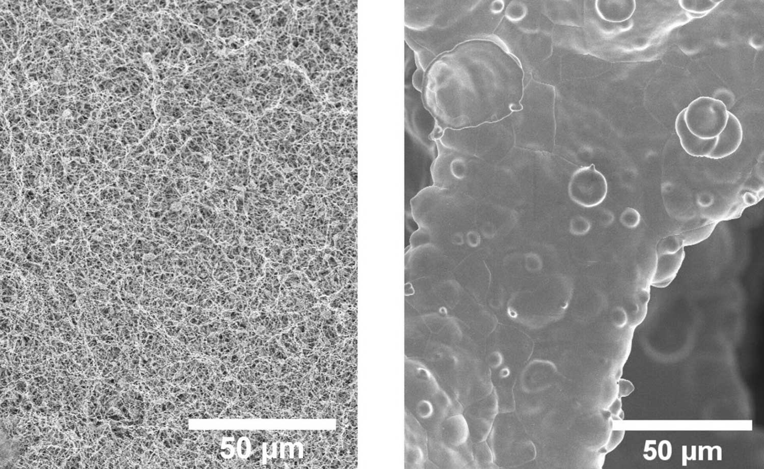 Les tapis métalliques de M-Spin (à gauche) possèdent une surface 1000 fois supérieure à celle des mousses métalliques (à droite).